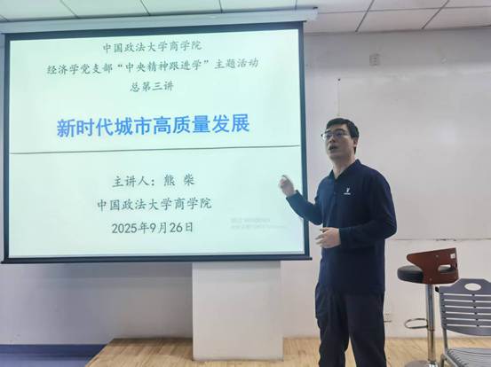 2025年9月26日上午,经济学党支部、学硕党支部在学院路校区图书综合楼522教室,联合开展“中央精神跟进学”主题活动第三讲。本次活动由经济学党支部书记张弛老师主持,经济学党支部副书记熊柴老师主讲,主题为“新时代城市高质量发展”,旨在增进党员师生和入党积极分子对中央城市工作会议最新精神的理解认识。