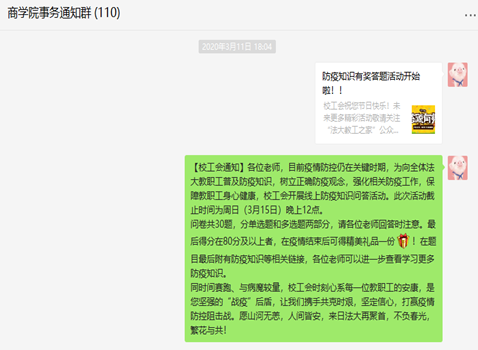 目前疫情防控仍在关键时期,为向全体法大教职工普及防疫知识,树立正确防疫观念,强化相关防疫工作,保障教职工身心健康,校工会开展线上防疫知识问答活动。此次活动问卷共30题,分单选题和多选题两部分,最后得分在80分及以上者,在疫情结束后可得精美礼品一份!在题目最后附有防疫知识等链接,老师们还可以进一步查看学习更多防疫知识。