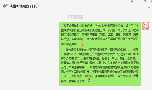 新型冠状感染肺炎防控工作专项资金”用于教职工的防疫用品购买的工作。目前已发放通知,后续开学将为老师们落实报销工作。