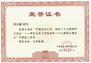在心得体会类别中,郑玉璐同学的征文《青年人才!生逢其时当奋斗》荣获三等奖,指导教师为陈明生教授。郑玉璐以博士生党员的身份,结合个人经验和深刻理解,激励青年学子坚持党的领导,跟随党的步伐,并强调了高质量学术研究对于推动社会现代化建设的重要性。