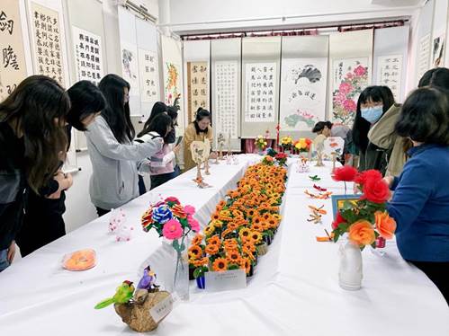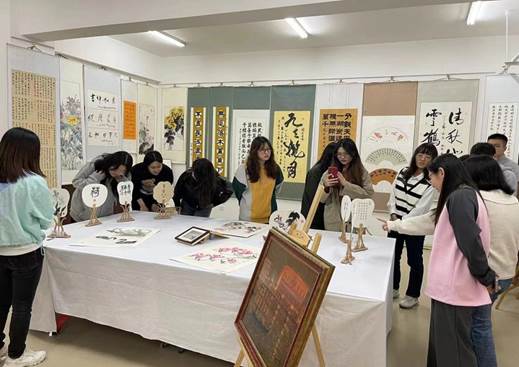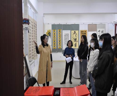 随后,王雁异老师和谢冲老师分别给大家介绍了每位老师的作品,讲述了老教师学习创作背后的故事。同学们为老教师克服困难,潜心书画,用笔墨书写人生,为党和祖国讴歌的精神所感动,为老教师的书画、手工艺作品所吸引。160多件书画作品,行、楷、隶、草、篆,气韵生动,美妙无双;山水、人物、风景、鸟兽等绘画作品挥洒自如、栩栩如生;130多件手工艺作品、花卉作品等技艺精湛。同学们驻足观看并拍照。