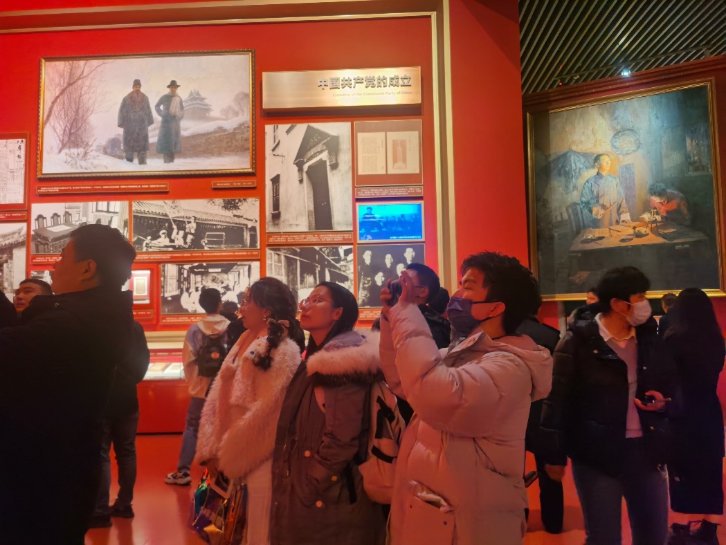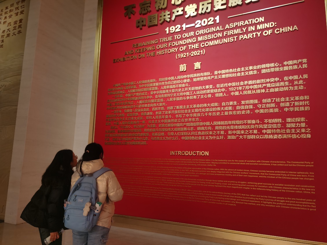 邵嘉琪:在进入馆内之前,我们一行人无不为络绎不绝的在北风中排队等待进入馆内的党员同志们的热情所惊叹。进入馆内,赫然在列的便是近代中国的屈辱历史和人民遭受的深重苦难的文字和照片。复行几步,党的成立点亮了民族复兴的灯塔,平复了我们心尖上的胆颤。中共一大党的诞生为中华民族伟大复兴提供了坚强的领导核心;至今,我国进入新时代,党为中华民族做出了三大历史贡献,实现了三次伟大飞跃。在新的历史起点上,我们要继续保持谦虚、谨慎、不骄、不燥、艰苦奋斗的作风,砥砺前行。此次参观党史馆不仅让我们以史为鉴,学习了优秀共产党人的伟大精神,也让我们牢记初心。不忘初心,以史为鉴,方得始终。