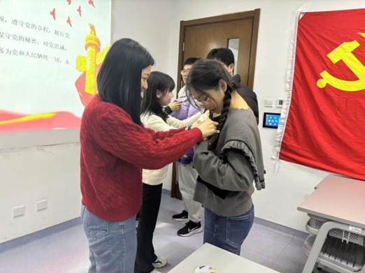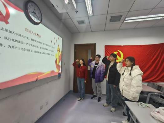 会议第二阶段为新发展三名预备党员的入党宣誓仪式。蔡雨颖同志宣读参加入党宣誓的预备党员名单,包括洪日、仇江宁、李成宇三位同志。入党介绍人蔡雨颖、冀源、沈涵月为三位预备党员佩戴了党徽。随后,全体预备党员在蔡雨颖同志的带领下紧握右拳,面对鲜艳的党旗庄严宣誓。三位预备党员纷纷表示,将以此次宣誓为契机,认真学习党的理论知识,不断提高自己的政治觉悟和政治能力,始终保持党员的先进性和纯洁性,发挥好党员的先锋模范作用。