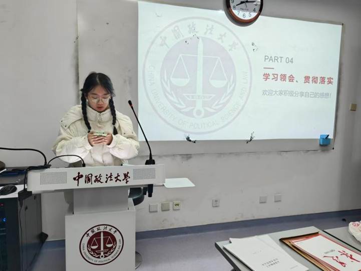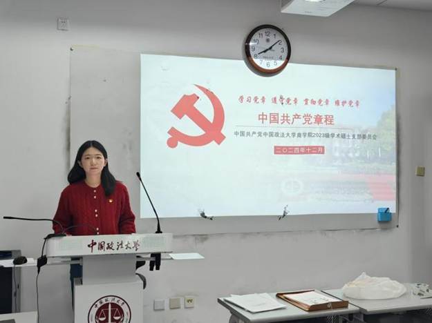 会议第一阶段为12月理论学习,党支部书记蔡雨颖为全体党员讲党课。她详细阐述了《中国共产党章程》的核心内容,包括党的性质、宗旨、指导思想、党的纪律、党员的权利与义务等,强调了学习党章、遵守党章、贯彻党章、维护党章的重要性。