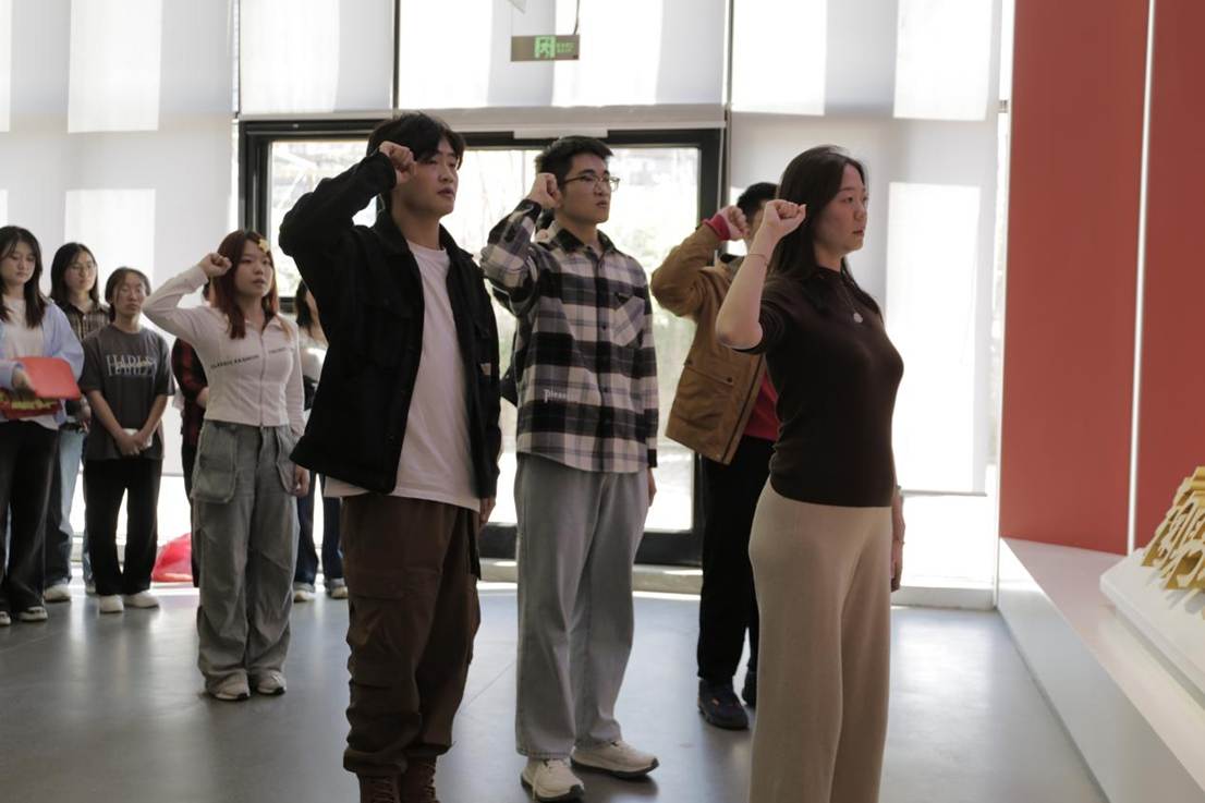 参观体验结束后,支部书记王晓曦同志带领全体党员与预备党员面向党旗庄严宣誓,重温入党时的决心与信念。“随时准备为党和人民牺牲一切”的誓言与焦裕禄“生也沙丘,死也沙丘”的遗志交织,激发了同学们的情感共鸣。宣誓后,王晓曦老师也结合中央八项规定最新部署,强调“要将‘不搞特殊化’的焦裕禄准则,转化为拒绝‘一份抄袭、一张假发票、一次违规加分’的日常坚守”,学生党员应“培养艰苦奋斗精神,不追求高消费,提高自控能力”,将清廉理念融入学术研究和为同学服务的全过程。