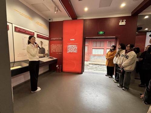 北京李大钊故居位于西城区新文化街文华胡同24号。活动当日,支部成员们怀着崇敬之情步入故居。首先映入眼帘的是庄严凝重的李大钊半身铜像,仿佛将大家带回那个风云激荡的年代。走进故居内部,各房间陈列布局依旧保留着当年的风貌。北房堂屋中,典型的老北京普通人家布置,八仙桌、椅子、条案、掸瓶、座钟及中堂画等,朴素而亲切。而中堂画两侧悬挂的“铁肩担道义,妙手著文章”对联,更是彰显了李大钊同志的崇高志向与革命情怀。