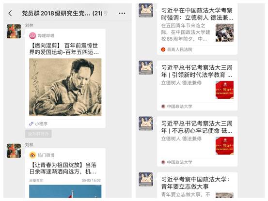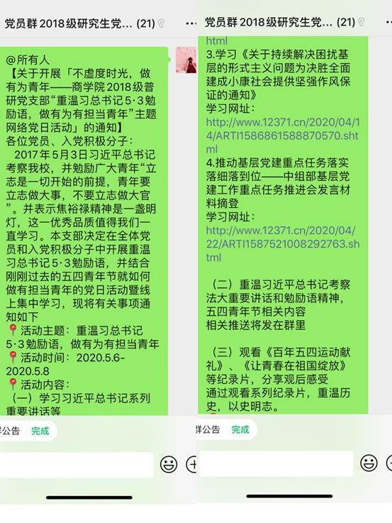 2018级普研党支部于5月6日至8日开展“不虚度时光,做有为青年——“重温习近平总书记5˙3讲话和勉励语,做有为有担当青年”主题网络党日活动,坚定党员理想信念,加强党员学习意识,打造富有生机活力、先锋模范作用的党员队伍。