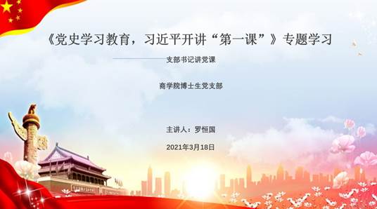 博士生党支部书记罗恒国通过腾讯会议线上为党支部成员讲授党课《党史教育,习近平开讲“第一课”》的专题学习。