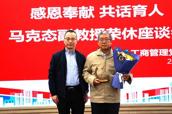最后,党委书记李欣宇为荣休教师马克态副教授颁发寓意感恩和祝福的荣休纪念牌和纪念品并合影留念。