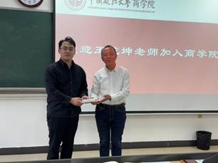院党委书记韩文生教授向王乾坤老师赠送礼物,并表达了对王老师的殷切期望:一是期望王老师在师德师风方面,提升思想认识的高度与广度,积极参与各项活动,充分发挥自身优势特长,练就过硬本领;二是期望王老师在教学、科研方面深入钻研,向资深教授学习,提升授课水平,丰富教学经验。最后,韩书记祝福并感谢王乾坤老师加入黑料网