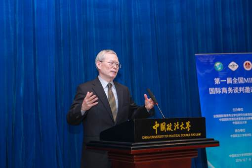 中国世贸组织研究会会长、原对外贸易经济合作部副部长、首位中国驻世贸组织大使孙振宇在大赛闭幕式上发表致辞。孙会长首先对大赛的顺利举办表示祝贺,对大赛组织及相关工作人员的辛勤工作表示感谢,并对各参赛队伍的表现给予充分肯定与赞扬,对年轻学子们寄予厚望,期待他们未来大有所为。随后,孙会长结合自己驻WTO的长期工作经历与出席大赛的嘉宾和师生做了几点分享。第一,弱国无外交,我们需继续为中国的国际地位与综合实力提升做贡献;第二,占领道义制高点极其重要,我们不能将发展中国家的立场丢掉,必须坚持传承和传递“大道至行”理念,深入推进“一带一路”倡议,共建人类命运共同体;第三,要善于学习,从老前辈、老师、同学以及对手身上学习,学以致用,强大自我;第四,坚持“凡事预则立”原则,充分的赛前准备是谈判致胜的前提;第五,谈判中进攻是最好的防守,谈判要学会抓住对方的软肋;第六,“魔鬼在细节中”,必须重视细节。最后,孙会长对法大举办了本次大赛以及各评委悉心专业的点评表示感谢,认为这对培养具备国家责任感的国际商务谈判精英复合型人才具有重要意义。