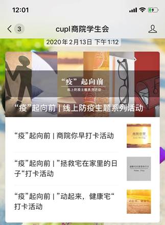 党有号召,团有行动。分团委也通过带领各班开展主题团日及主题班会活动,宣传防疫知识、弘扬抗疫期间先进事迹,弘扬正能量,同时还策划了“‘疫’起向前”线上防疫主题系列活动。其中“小宅的一天”防疫知识宣传、“27号信箱”文学艺术评论互动、“商院你早”每日学习打卡、“健康宅,动起来”每日运动打卡、“拯救宅在家的日子”趣味小技能等线上活动已于2月中旬陆续推出,用以丰富学生在家的日常生活,培养在家的健康生活学习习惯。