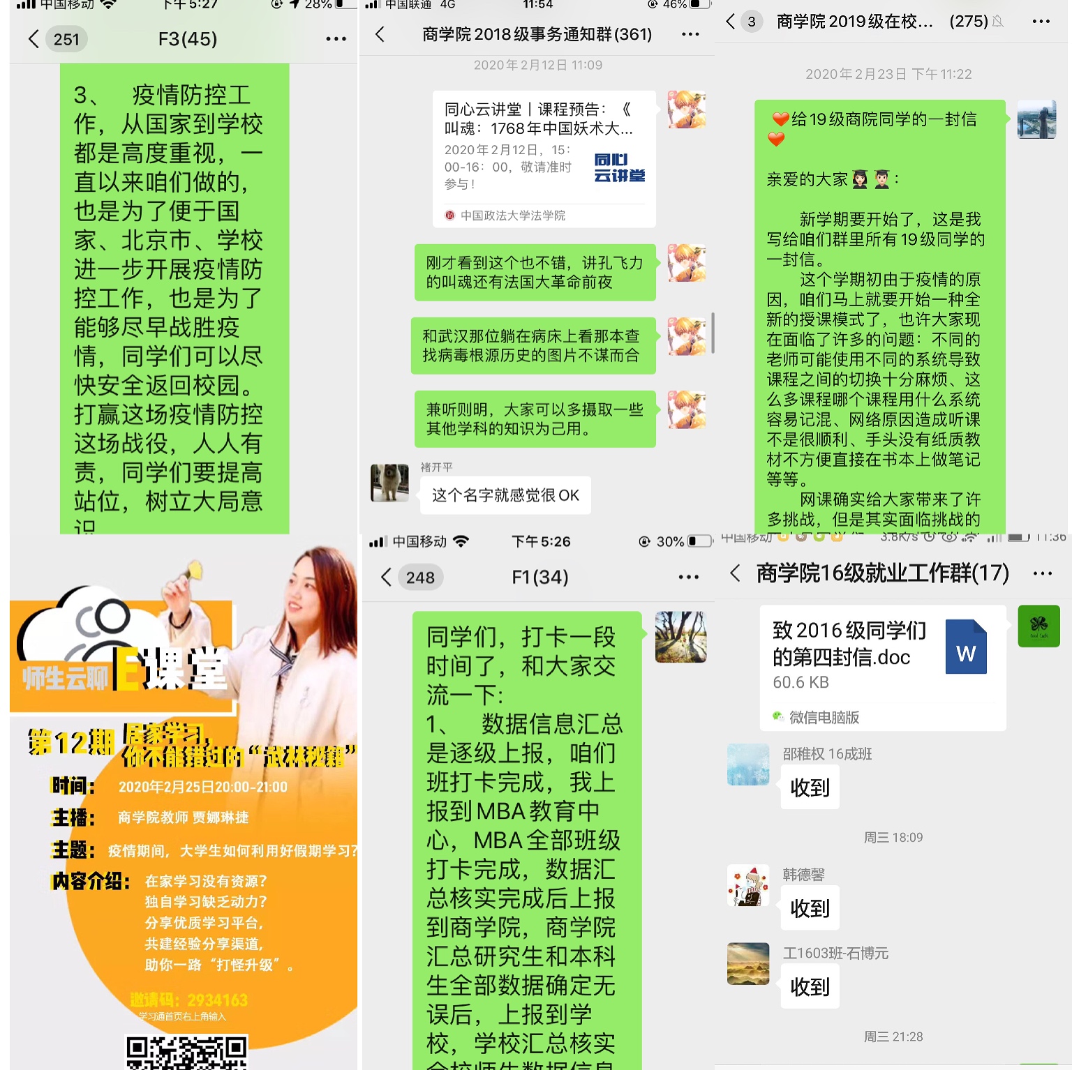 除了疫情防控数据统计工作,为帮助学生们更好地适应特殊时期的学习与生活,各个年级的辅导员也为学生们开展了富有特色的思想工作:2019级辅导员结合网络开课的现实背景,撰写《给19级商院同学的一封信》,帮助同学们增强网络授课适应性;2018级辅导员推荐优质的、多样性的网课给同学们,和同学们一起进直播间听课,和大家增加互动,深入了解学生的思想状态;2016级辅导员针对当前防疫工作和毕业班特点,专门撰写《致2016级全体同学的一封信》,鼓励同学们在做好安全防护的同时积极准备接下来的求职就业;双学士辅导员积极参加师生云聊E课堂活动,指导学生如何利用好假期进行学习;MBA学工办积极开展思想工作,引导学生树立大局意识,弘扬奉献精神,在不同地区、以不同方式为打赢疫情防控阻击战作出贡献,成效显著。同时,为切实给学生们提供帮助、解决实际问题,学工队伍已协助本院6名受疫情影响严重学生向学校提出临时补助申请,共获补助1.3万元。