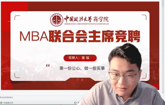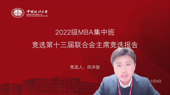 第一位竞选者田洪俊同学阐述了自己的参选理由以及竞选分析,他希望起到学校和企业之间桥梁、纽带作用,更快的推广开学校知名度,打造法大品牌竞争力,实现校企联合、强强联合。最后对MBA联合会今后的工作安排和发展方向做了展望,他希望通过联合法各路精英、相互学习从而能加强提升法大MBA核心竞争力。