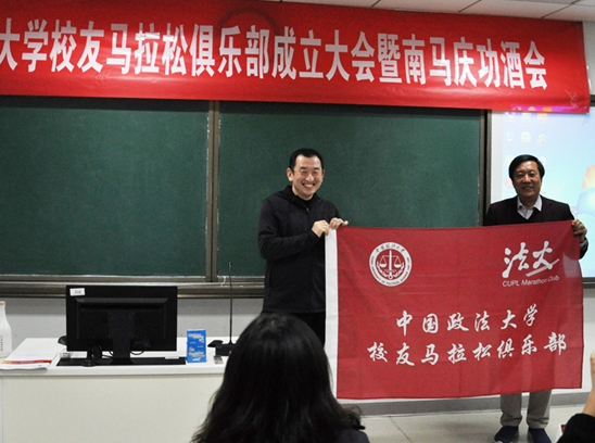 在随后的授旗仪式中,俱乐部执行主席傅元从冯世勇副校长手中接过了校友马拉松俱乐部旗帜,并向在场领导和校友们解读了俱乐部logo的设计思路。象征着法大校友的“法大”两个字和终点冲线的形象,寓意富有凝聚力和意志力的法大人一起携手奔跑,取得比赛胜利。