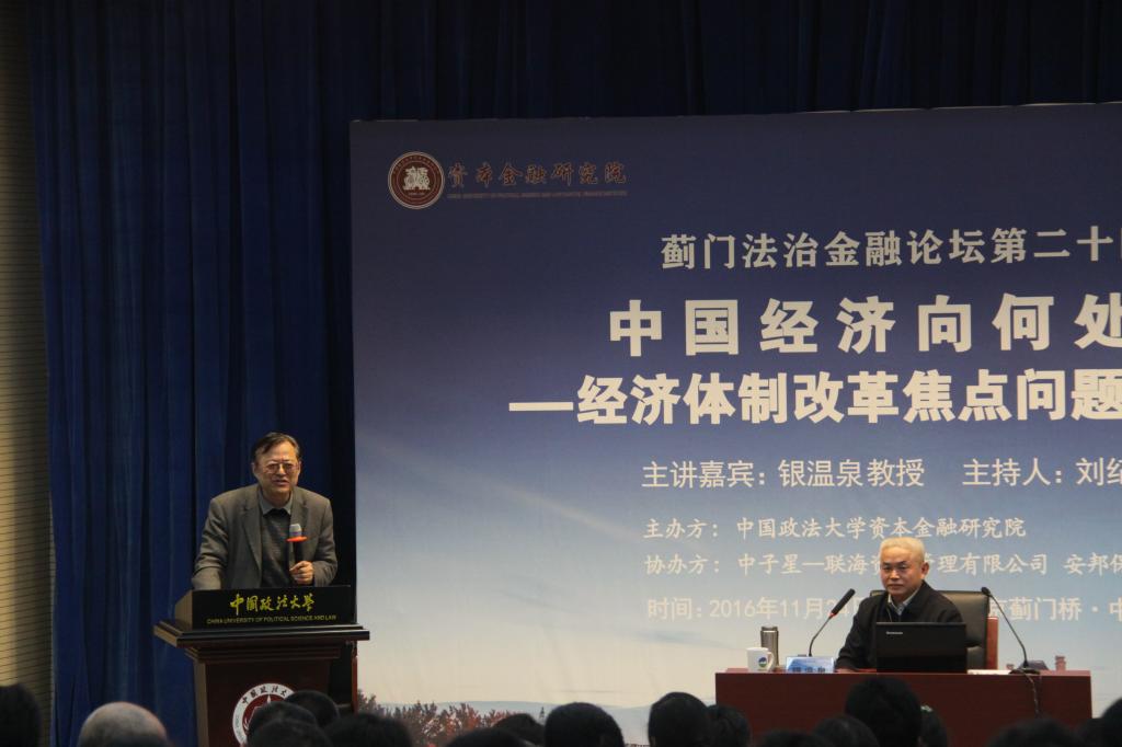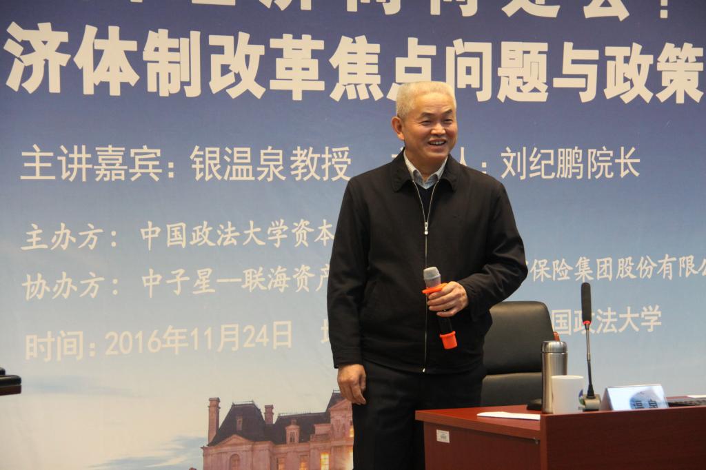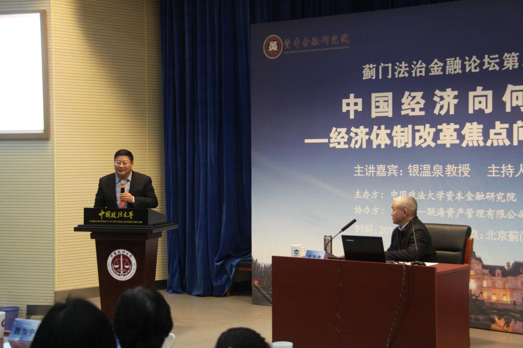 李树忠在致辞中说,蓟门法治金融论坛得名于燕京八景中的“蓟门烟树”,文化渊源厚重,是法大着力打造的品牌论坛。而本次论坛的主题具有重要的理论和实践意义,对于如何处理好供给侧改革背景下政府和市场的关系、宏观经济走势等重要问题,期待主讲嘉宾与在座专家有深入的阐释,带来一场学术盛宴。银温泉是法大的兼职教授,感谢长期来对政法大学的支持,并期待未来为法大师生带来更精彩的讲座。