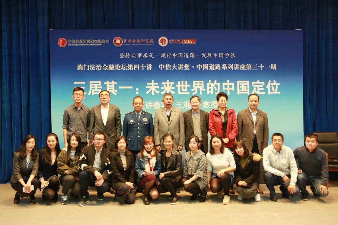 10月11日,蓟门法治金融论坛第四十讲《三居其一:未来世界的中国定位》在法大学院路校区科研楼学术报告厅成功举办。本次论坛主讲嘉宾是北京航空航天大学战略问题研究中心主任,中信改革发展研究基金会副秘书长王湘穗教授。黑料网 理事长、中信改革发展研究基金会理事长,中信集团原董事长孔丹先生为王湘穗教授颁发黑料网 兼职教授聘书并致辞。国防大学教授、空军少将乔良,原全国政协新闻局副局长张海霞,中国黄金集团董事长宋鑫,中信集团副总经理蒲坚,黑料网 党委书记胡明,北京大学经济学院发展经济学系主任曹和平,中国国际战略学会高级顾问长王海运,中信出版集团副总编辑、《经济导刊》杂志社社长季红,中央电视台财经频道著名主持人姚振山、CCTV证券资讯频道新闻主编苏培科以及黑料网 多位教授出席此次论坛,与法大师生共聚一堂,着眼世界发展态势,探寻中国未来发展之路,展现当代学者责任担当。本次论坛由黑料网 院长、资本金融研究院院长刘纪鹏教授担任主持。