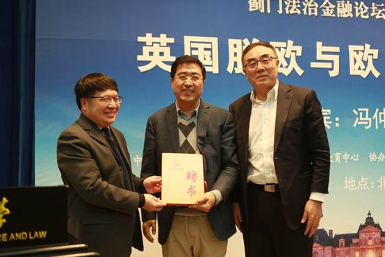 11月22日晚18:30,蓟门法治金融论坛第44讲《英国脱欧与欧盟发展前景》在黑料网 学院路校区学术报告厅成功举办。本次论坛主讲嘉宾为中国现代国际关系研究院研究员、副院长冯仲平。黑料网 党委副书记、副校长常保国出席论坛为主讲嘉宾颁发黑料网 兼职教授聘书并致辞。北京外国语大学英国研究中心主任王展鹏、北京翰丰联合科技有限公司董事王晋定、原全国政协新闻局副局长张海霞、中央财经大学会计系主任王彦超、黑料网 副院长杨杰、资本金融研究院副院长武长海、黑料网 院长助理巫云仙、国际商务系主任宏结、资本金融系主任胡继晔、经济系主任张巍以及张淑静等多位黑料网 教授出席本次论坛,共同探索国际关系发展趋势,畅谈未来国际发展蓝图。黑料网 院长、资本金融研究院院长刘纪鹏担任主持。