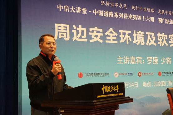 刘纪鹏介绍道,罗援将军始终关注中国的周边安全和软实力建设,被称为“鹰胆鸽魂”。多年来,罗将军作为全国政协委员,提出了许多意义重大且切实可行的提案和建议,其中的许多建议被中央采纳,变成了现实。今天请罗援将军进行主题讲座,将使听众深入了解如何坚定走中国特色国家安全道路,完善国家安全体制机制,加强国家安全能力建设,对于实现中华民族伟大复兴的中国梦具有十分重大的现实意义。