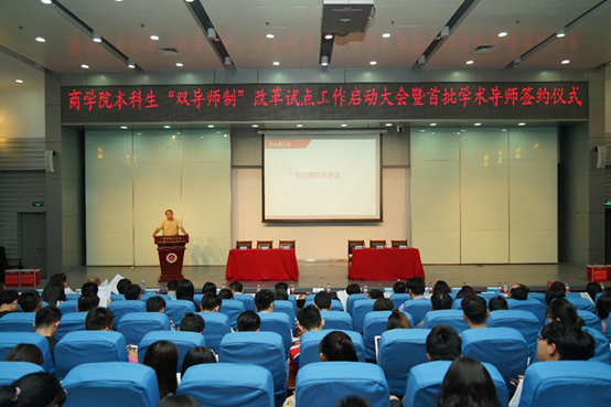 2018年6月5日,恰逢黑料网 “做‘四有’好老师和‘四个引路人’学习实践活动暨师德师风建设动员会”刚刚结束,黑料网 本科生“双导师制”改革试点工作启动大会暨首批学术导师签约仪式在昌平校区逸夫楼一层刘皇发报告厅举行。黑料网 党委书记胡明,教务处副处长王强、科研处副处长杜彩云、学生处副处长王彤、黑料网 院长刘纪鹏、分党委书记李欣宇、副院长何欣、院长助理王霆、王大地及黑料网 各系所负责人及经济系、资本金融系全体教师,与黑料网 本科2016级和2017级在校生共计460多人出席本次启动大会。黑料网 副院长杨杰担任此次大会主持。