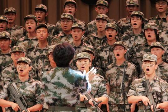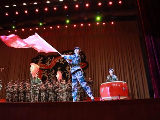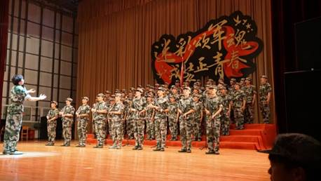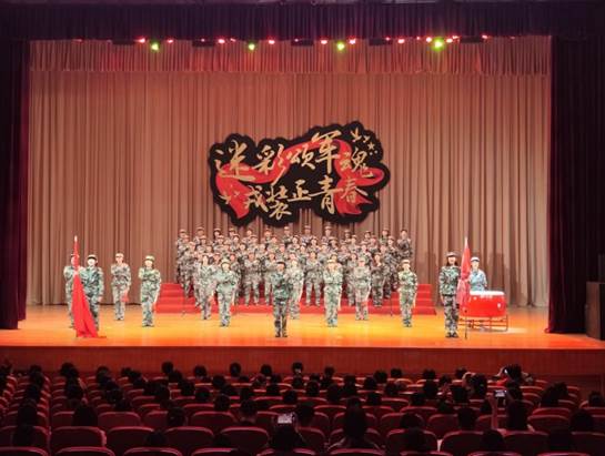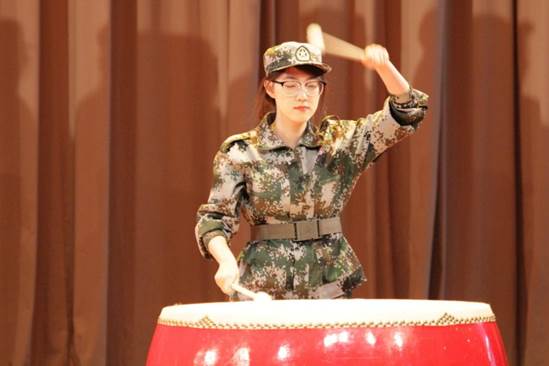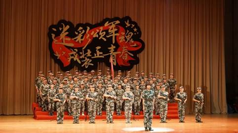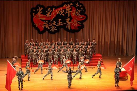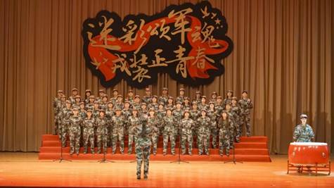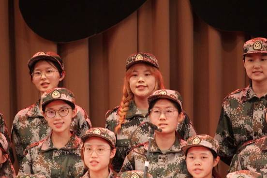 学子们从一次又一次的辛勤排练到舞台上的全力以赴,嘹亮振奋的《中国军魂》和《精忠报国》响彻礼堂、振奋人心。