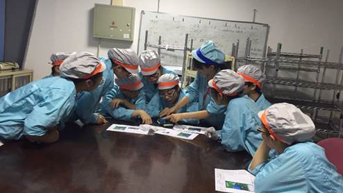 安宁、柳戈、邱晶等十位同学被安排到MIMA-FA(手工插件/焊接--组装)车间实习。该车间主要是在经过SMT车间的PCB板(印制电路板)上插入电子元器件,接着通过波峰焊接(机械操作)将电子元器件牢牢固定在PCB板上,并对部分无法耐受机器高温的元器件进行人工焊接。完成以上工序之后,PCB板还将经历性能和精度测试,合格的半成品进入FA工序,即将已完成插焊的PCB板(亦可称PCBA板)与电表外壳进行组合加固并设置相应的参数。MIMA-FA车间的生产工序最为繁杂且工作人员最多,实习的同学们都感觉大开眼界、获益良多。