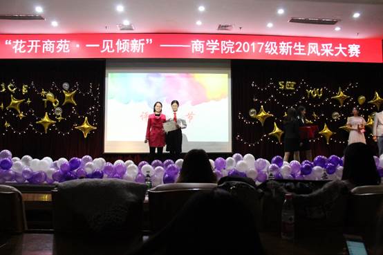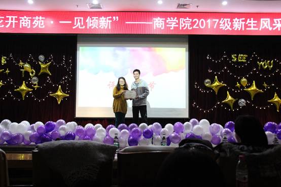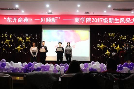 欣赏完精彩的节目,终于来到了紧张的评审环节。工商管理1702班和国际商务1701班分别荣获新生风采大赛一等奖和二等奖,金融工程1701班和甘继忠同学荣获三等奖。评委郭虹老师、吴颖老师、王晓曦老师及肖佑虹同学分别为他们颁奖并合影留念。