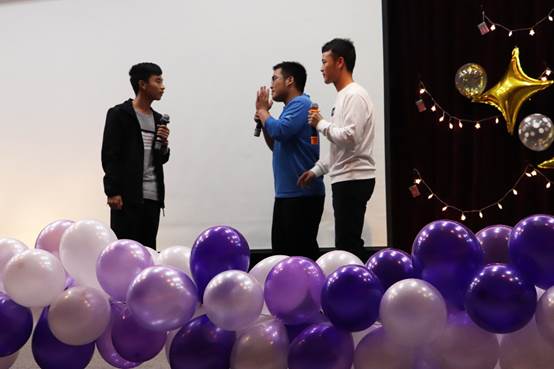 在观众的欢呼声中,工商管理1702班的同学们上场了。他们带来的小品《广告双子星》表演精彩,逗趣十足,幽默生动的语言动作引发了观众们的阵阵笑声。