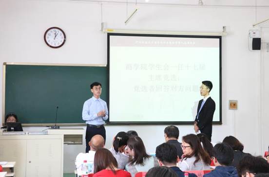 学生会主席竞选,候选人查鸿铭和刘宜鑫上台抽取问题并依次发表演讲。查鸿铭以“最终归属是服务”为主题发表演讲。他回顾了自己任职部长的工作体验,并且从流程规范、体育活动、品牌宣传三方面进行了工作设想。他表明自己有信心完善学生会各项工作的不足和建设更有效率的学生会。