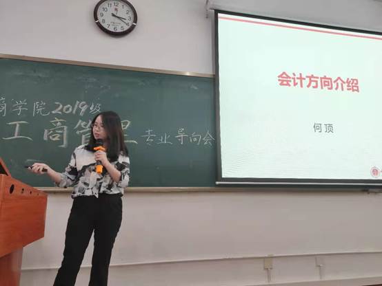 随后,何顶老师向同学们介绍了会计学专业,以同学们对会计方面的了解为引入,详细说明了“何为会计学”以及“会计学的前途”这两个问题。紧接着,唱小溪老师向同学们解释了作为我院特色的“法商管理”这一概念,也欢迎同学们积极选择法商系这一方向。在活动的最后,顾凡老师简要介绍了我院实行的“双导师制”,对本次导向会的内容进行了总结,并向同学们提出了期待。