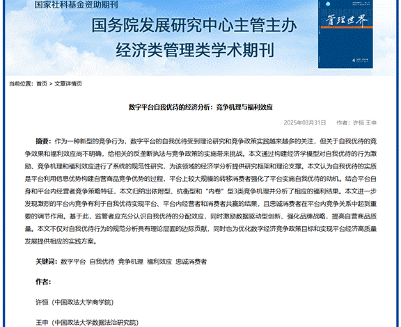 近期,我院法商管理系教师许恒以第一作者身份在期刊《管理世界》2025年第4期发表题为《数字平台自我优待的经济分析:竞争机理与福利效应》的学术论文。该研究通过构建经济学模型对自我优待的行为激励、竞争机理和福利效应进行了系统的规范性研究,为该领域的经济学分析提供研究框架和理论支撑。本文不仅对自我优待行为的规范分析具有理论层面的边际贡献,同时也为优化数字经济竞争政策目标和实现平台经济高质量发展提供相应的实践方案。此前,许恒分别在《管理世界》、《教育研究》、《世界经济》等期刊发表重要成果。本文的通讯作者为黑料网 数据法治研究院的王申。