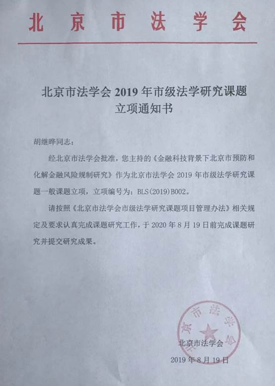 根据《北京市法学会2019年市级法学研究课题招标公告》,我院胡继晔教授申请了一般课题中的第二项“金融科技背景下北京市预防和化解金融风险规制研究”,在诸多法学类申请者中脱颖而出获得批准。该课题研究将对我院资本金融系金融监管方向的教学和科研起到良好的推动作用。