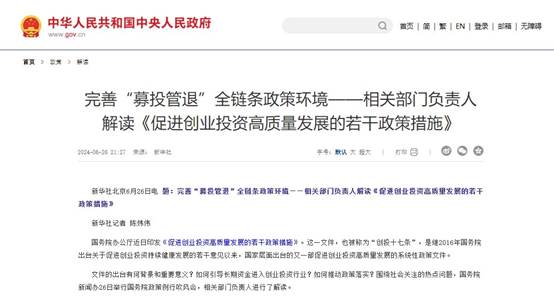 6月26日,国务院新闻办举行国务院政策例行吹风会,介绍《促进创业投资高质量发展的若干政策措施》(以下简称《政策措施》)有关情况。国家发展改革委相关负责人表示,《政策措施》出台,对完善创业投资“募投管退”全链条政策环境和管理制度,支持创业投资做大做强,具有十分重要的意义。