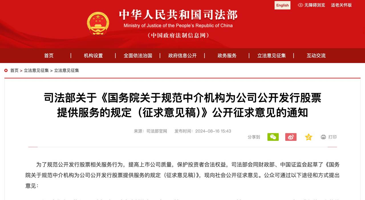 司法部会同财政部、证监会起草了《国务院关于规范中介机构为公司公开发行股票提供服务的规定(征求意见稿)》(下称《征求意见稿》),于2024年8月16日至2024年9月15日向社会公开征求意见。