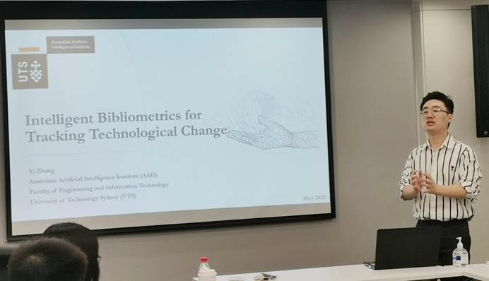 悉尼科技大学澳大利亚人工智能研究院高级讲师张嶷博士以“Intelligent Bibliometrics for Tracking Technological Change”为题首先进行报告。张嶷博士主要围绕“如何运用文献计量方法和‘AI’方法来追踪实际话题,特别是与技术创新管理和信息科技相关的内容”,着重介绍了“搜索评估”、“技术预测”、“科技演化”和“知识融合”等科技创新管理领域未来的重点研究方向。