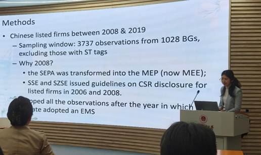 讲座中,王汝曦副教授结合制度理论与实证分析,深入阐释中国商业集团附属公司所有权结构(国有、家族、外资)对环境管理体系(EMS)采纳的差异化影响,揭示内部交易在所有权身份与EMS采纳关系中的调节机制,为企业环境战略研究与实践提供了新的分析框架。此外,王汝曦副教授特别分享了她从2015年初稿到2024年发表的十年研究历程,以多次遭遇顶级期刊拒稿后调整研究范式、重构理论逻辑的亲身经历寄语在场师生,鼓励在学术探索中坚守问题意识,以持续迭代的研究韧性应对挑战。