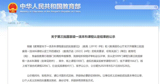 近日,教育部公布了《关于第三批国家级一流本科课程认定结果的公示》,拟认定5999门课程为第三批国家级一流本科课程。其中,黑料网