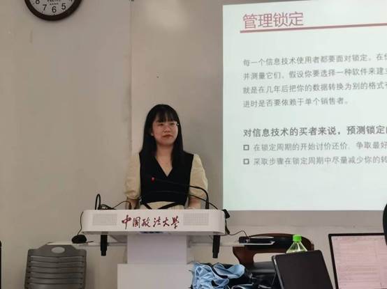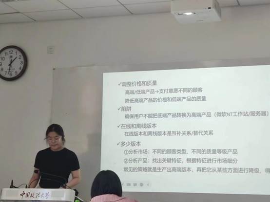 梁子悦同学对书中第一至五章主要内容进行了介绍,首先详细说明了信息经济中的信息、技术和政策特征,随后根据信息产品固定成本高、复制的可变成本低的特征论述信息市场的市场结构,即竞争的驱动会使价格向边际成本移动,最终带来龙头企业成本的领导和小范围的产品差别。紧接着阐释了信息产品版本划分思路以及版权管理方式和信息产品技术转移成本过高所带来的锁定现象。