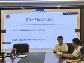 会议第三部分由高年级优秀学生代表进行发言。2021级政治经济学专业谭先杰同学向新同学们分享了个人的学习经验和教训。第一,要正确认识自我,做好未来规划;第二,要认真对待日常学习,积极参与读书会活动;第三,要平衡好学业和就业的关系,设定未来的就业目标和方向,并提前做好准备。