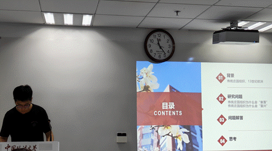 李成宇同学从时代背景、传统庄园组织为什么衰落、传统庄园组织为什么复兴三部分内容进行了汇报。他首先介绍了13世纪欧洲的时代背景,该时期欧洲的边疆运动结束,人口呈现了递增的趋势,传统的庄园组织形式由于市场经济的兴起逐渐衰落;随着人口的不断增加,当土地有限时,劳动和土地要素的相对价格发生了改变,这些变化迫使领主修改庄园契约,恢复了以各种劳役直接耕种领地的传统做法。李成宇同学随后指出,当前社会中习俗和制度的改变都是渐进式的,某一事物兴衰取决于该时代下当事人对成本和收益的衡量。针对李成宇同学的报告,赵文睿老师提出制度变革存在自上而下和自下而上两种情形,对于土地价值的含义需要根据其所处研究范式去理解。冀源同学就好的制度是如何衡量这一问题与在场老师和学生进行了讨论。黄立君老师和周敏丹老师对李成宇的汇报表示了肯定,并鼓励同学们在以后的阅读中要善于找到自己感兴趣的问题并展开深入的研究,学会带着思考阅读。