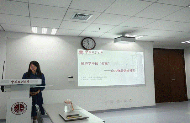 周霖同学从公共物品的角度出发,以“经济学中的‘灯塔’——公共物品供给博弈”为题进行汇报。周霖同学首先向大家介绍了本书的作者诺斯,并概括阐述了《西方世界的兴起》一书中的核心观点,接着聚焦于书中的一个内容,介绍了公共物品的特征以及科斯的论文《经济学中的灯塔》中的主要观点:公共物品并不是只能由政府提供,私人也可以提供公共物品的结论。随后她使用博弈论的方法论证了科斯的观点。蔡雨颖同学对报告进行了点评,她认为周霖同学报告的切入点十分新颖,建议今后做主报告的同学进行借鉴。黄立君老师和司海平老师对周霖同学的报告内容表示了肯定,并且对如何更好的进行展示提出了建议。