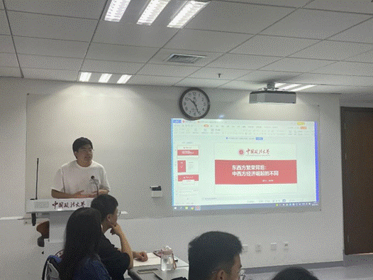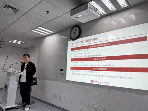 靳耀祖同学从制度成本的视角出发,对“好坏”制度进行辨析。靳耀祖同学认为,国家间经济实力的强弱并不是衡量制度好坏的标准,“好”制度应当适应经济发展水平,且能够促进经济增长。并就“如果能够提前建立‘好’的制度,是否经济增长就能实现新的突破”这一问题与大家进行激烈讨论。随后,黄立君老师指出报告中“完善的制度”这一说法并不严谨,提出时应该慎重。周敏丹老师对生产力、生产关系,经济基础和上层建筑的概念进行剖析,指出经济基础其实也是一种制度安排,经济增长更多的还是取决于生产力的发展。尹福同学最后对报告进行了点评。