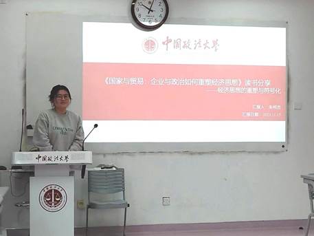 国际商务系在教学图书综合楼418举办研究生读书会。国际商务系师生共聚一堂,研读著作《贸易与国家:企业与政治如何重塑经济思想》。国际商务系主任梁涵副教授,以及国际贸易、世界经济专业2022级、2023级硕士研究生参加。读书会报告人包括王璐璇、朱柯杰、孙永贺、张媛柯、李欣、唐世洲、张滋等七位同学。读书会由胡明教授主持。