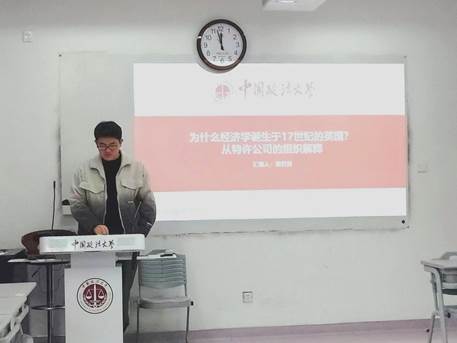 唐世洲同学介绍了特许公司在17世纪英国经济思想转型过程中起到的作用,即尽管特许公司处于正式的国家机器之外,但它们是调节国家和商人之间关系的一个关键制度工具。特许公司的新颖性和排他性,成为了当时处于政治边缘的商人在公共领域讨论的话题。