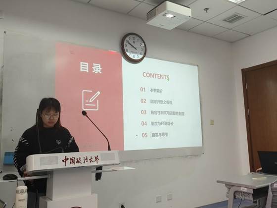张小乔同学就国家兴衰的原因、制度与经济增长的关系以及包容性制度和汲取性制度等问题进行了汇报,认为地理假说、文化假说、无知理论三种理论解释国家兴衰原因时存在一定的局限性,而包容性制度与汲取性制度则提供了一个新的视角。