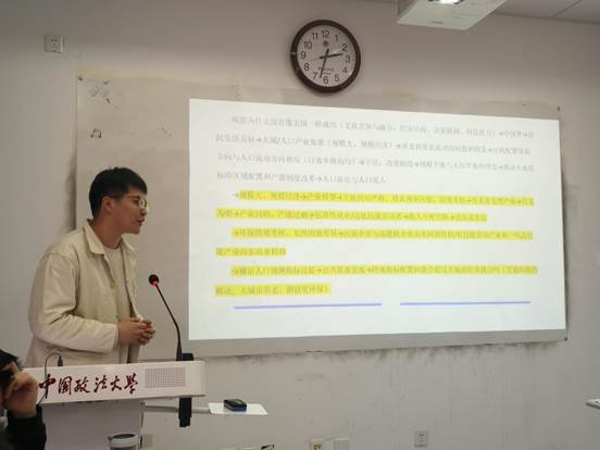 点评人贾文轩同学对该报告进行了肯定,认为孙天奇同学结合当下我国城市发展现状分析城市化进程中面临的各种问题,报告内容较为丰富。随后,各位老师就中国传统文化中的“乡土情怀”与同学们展开了讨论。张国栋同学认为老一辈农民留守故土,不愿意进城居住的原因是无法割舍故乡。周敏丹老师提出要用发展的眼光看问题,新生代流动人口面临着更大的生存压力,为了得到更多的就业机会更愿意进城务工并留在城市。
