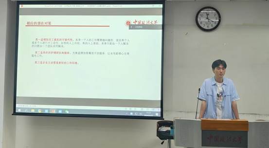 朱天赐同学以“贪婪的工作——女性职场不公的幕后推手”为题,首先对女性遭遇职场不公的原因进行探讨,他指出对于女性的歧视是历史上阻碍女性事业发展的主要原因。随后,他转向当代职场,引用戈尔丁的观点,认为“贪婪的工作”是当前女性职场不公的根源,并提出增加员工彼此的可替代性、良好的护理团队和服务以及企业主动营造更好的工作环境等对策建议。最后,他对女性遭遇职场不公的原因进行总结,女性职场不公归根结底是贪婪的工作对女性产生的剥削和压迫,要做的是消除贪婪的工作对员工的剥削和压迫,而非让工作平等地剥削每一个人。点评人张小乔同学谈到,朱天赐同学从女性职场的不公现象入手,阐述了作者关于女性职场不公的根本原因——贪婪的工作;并从效率与公平的角度,提出了自己对女性职场不公的思考,认为我们要想兼顾劳动力市场上的效率与公平,应该做到消除贪婪的工作对员工的剥削与压迫。周敏丹老师针对汇报中涉及的对策,建议同学们查阅劳动经济学相关的文献来佐证观点,丰富读书报告。