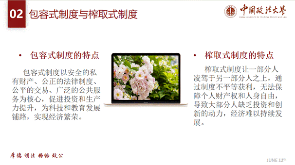 第二部分,任静怡同学首先对制度导致国家贫富的原因进行了阐述。国家的发展成功与否,并非仅仅由地理环境或文化伦理决定,更多的是由制度安排所影响。作者通过列举几个实际的国家发展例子,并对三种比较流行的论点一一进行了反驳,最终通过加雷斯市的例子得出制度决定贫富的结论。国家采取包容式性的制度会造就繁荣,相反采取榨取式的制度会带来衰退。且作者在书中强调了包容性制度对于促进经济增长的重要性,并以美国为例,说明了包容性制度如何为经济发展提供动力。
