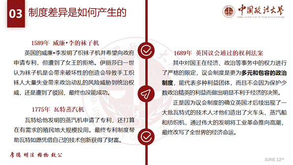 第三部分,税国楠同学对本书的内容进行了总结。本书认为,经济与政治制度决定国家的贫富,包容性的制度造就繁荣,而榨取式的制度带来衰退。国家之间政治制度的差异来源于历史关键时期的选择,偶然事件带来的制度偏离会让国家的发展大相径庭。而制度一旦形成变具有惯性,因为政治制度和经济制度能互相强化。榨取性制度会不断自我复制和强化;包容性的制度反馈则是良性的,通过多元制衡达到军事的稳定。最后税国楠同学指出,书中对于贫困国家如何摆脱经济失败现状没有提出建设性的方案或意见。