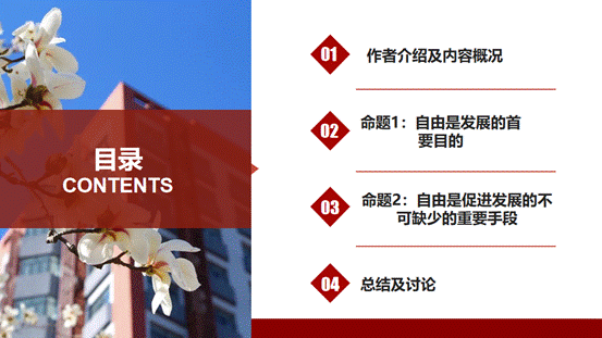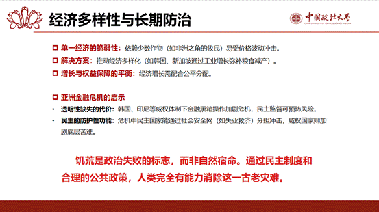 随后,毛天赐、杨宇航两位同学介绍了实证分析部分(第4-10章)。森通过多个案例展示了自由作为工具如何促进发展:民主制度通过透明性与问责制防止饥荒,如印度独立后未发生大饥荒;妇女赋权(社会机会)能降低生育率、提升儿童健康;教育自由则促进人口转型与经济增长。这些实证研究进一步支持了自由的工具性作用。
